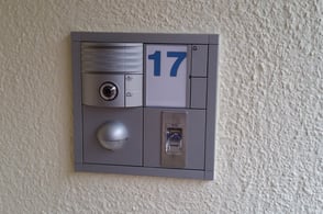- Mobotix T24 Türsprechstelle mit Kamera. Einbau in einen bestehenden 2x2 Siedle Unterputzrahmen über Adapterrahmen.